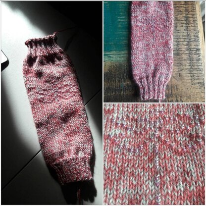 Amalgamation leg warmers combine some of the softest independent dyer yarns to create marled beaded magic. Using 2 strands of Candy Skein Delicious Series, one in colorway Foil Wrapper and one in colorway Watermelon creates not only a stunning color combination, but the mix of 70% alpaca/20% silk/10% cashmere feels extraordinarily soft and comfortable. The pattern explains how to knit Amalgamation leggings in the round, using a set of 5 double pointed needles, and how to knit them on a set of straight needles with seaming the 2 halves together.