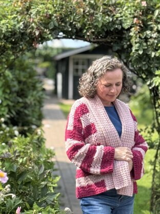 A lovely cardigan with textured stitchwork, wide colourful stripes, a feminine yet comfortable fit and a large shaw collar.
