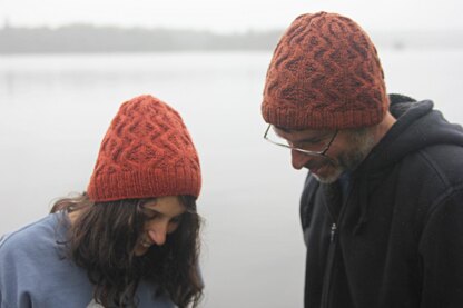 Amaretto is a cabled hat that features bold, elegant lines worked in a cabled, textured motif. Pattern includes instructions for hat with deep brim and slouchy fit as well as folded brim and beanie fit.