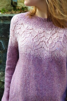 AMAYA is a seamless top-down sweater with a lace stripe on the round yoke made in contrast color. The picture shows size 2 with 10 cm /4” of positive ease.