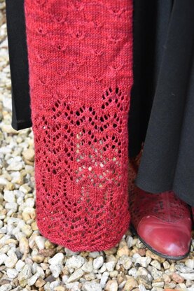 This long red scarf is worked in a simple texture that recalls fire sparks. Two lacy edging figuring flame patterns are completing the piece. Left and right sides are worked separately and joined at the neck with Kitchener stitches.