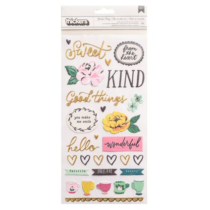 Add an elegant pop of color to your projects with Thickers phrases and icons! They're perfect for dressing up your cards, scrapbooks, home decor, and so much more. This package includes 70 Thickers in a variety of phrases and icon accents, some with a gold foil finish.