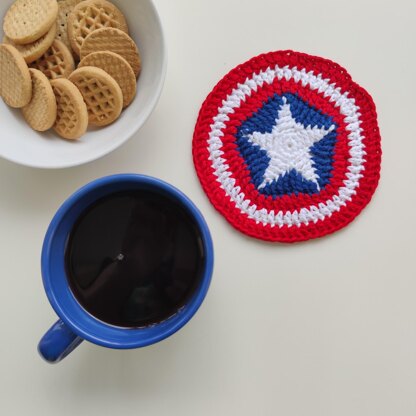 Yarn Cup coaster requires approximately 45-50 grs of cotton yarn (15-17 grs of each colour: red, white and blue). Weight/length: 50 g = approx 70-75 m. You can use any cotton yarn with a similar weight/length or thiner (if the yarn is about 50g=130-140m, you can work with a yarn held double, use 2 strands of cotton yarn).