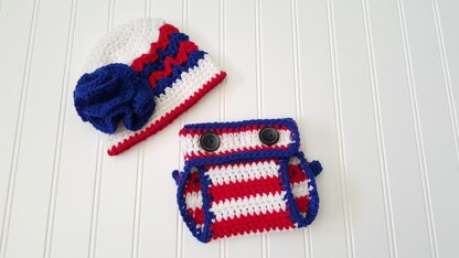 Materials Blue, Red and White Yarn worsted weight yarn 5.5mm hook for hat and 5mm hook for diaper cover, needles for weaving in ends