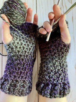 I found myself in a purple mood one day, and this beautiful skein of yarn was hiding in my stash, just waiting for the right design. And so the amethyst mitts were born. The simple textured design is perfect for multi-colored yarns. These mitts work up quickly, making them ideal for gift or sale. The length can be easily adjusted. Make a pair in all of your favorite colors!