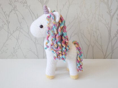 Using the materials suggested this unicorn measures 24cm (9.5 inches). Any yarn can be used with this pattern with an appropriate sized crochet hook to create a tight tension, although other yarns may affect the size of the finished unicorn. Suggested materials: DK (8ply) 100% cotton yarn, 3mm and 2.5mm crochet hook, toy stuffing and 9mm safety eyes.