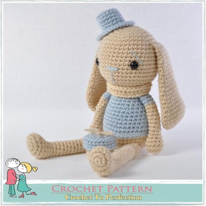 Amigurumi bunny measures 8” / 20cm while sitting and 12” / 30cm while standing up including his hat if using similar yarn and hook. You can make your bunny smaller or bigger by using smaller size hook with thinner yarn or bigger size hook with thicker yarn.