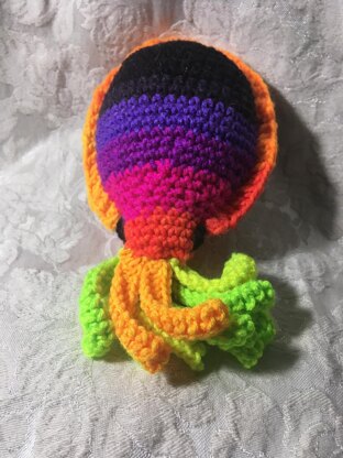 About 8 inches long with worsted weight yarn and G hook. Easy beginner pattern. Uses multicolor yarn to mimic the cuttlefishes ability to change color. Uses less than one skein of yarn.