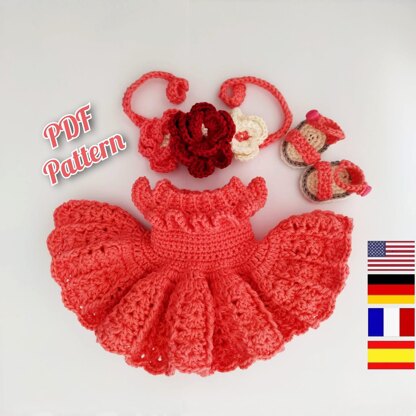 This crochet pattern contains a detailed description with a lot of step-by-step photos of how to create clothes for doll: dress, shoes, ribbon and panties.