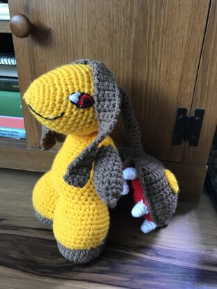 Pattern for an amigurumi mawile. Gauge is not really important. Finished project should be about 8.5 inches tall. It has about 28 separate pieces. Head is worked in in the round. Body and one leg are worked in one piece in the round and then yarn is reattached to add the second leg, also in the round. Feet and arms are worked in the round. The stem and one half of the carnivorous plant are worked in one piece with the stem being in the round and the bottom part worked across. The yarn is then reattached to work the other half of the bottom in short rows and then attached again at the other end to work the part that attaches to the head in the round. The red portions of the carnivorous mouth are worked across as are the bangs in the front. The teeth for the mouth are worked in the round. I considered this projects an intermediate level because of all the shaping, pieces, and sewing together involved. Example uses Red Heart Super Saver.