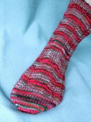 The sample shown was knit in Blue Moon Fiber Arts Socks That Rock Mediumweight, shade Jingle Bell Rock.