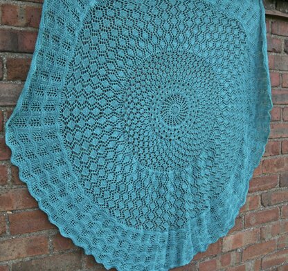 Worked from the centre out, this Pi-shawl is approximately 48” (122 cm) in diameter when worked to pattern tension. Pattern tension is based on the Crest of the Waves pattern, with one pattern repeat measuring 2” (5cm) wide and 1-5/8” (4cm) high. Achieving exact pattern tension is not vital but it may affect the finished size of your shawl and the yarn yardage required if you do not.