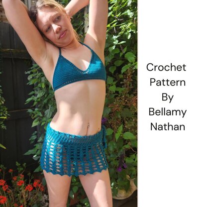 Make your own stunning swimwear with the "Amy" crochet trio bikini pattern! This beautiful set features a flattering bra top and thong style bottom together with a matching skirt, that's perfect for beach days and poolside lounging.