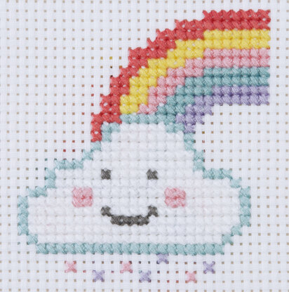 This beginners cross stitch kit features a pretty rainbow above a rain cloud.
