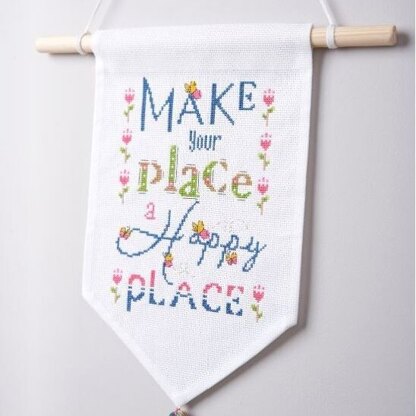 Your happy place is not just about the space you are in, but how you make that space a good place for you to be. This wall hanging slides onto a wooden pole and you can add a tassel at the bottom for fun. Use the colours shown here or choose those that make you feel happy.