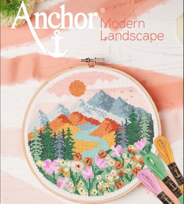 The landscape design in cross stitch is inspired by modern geometric illustration and impressionist artworks. The elements are clean and modern, but like Van Gogh’s landscapes and Monet’s haystacks, this design is filled with beautiful evening sky colours. The layered mountains are yellow and orange and there are some bright modern florals in the foreground. The colours are semi-abstract and meant to be an impression of the oranges, pinks and teals one sees in a brilliant sunset.