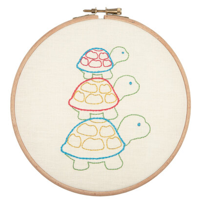 An adorable embroidery design featuring a family of three turtles. It is the perfect freestyle embroidery kit for beginners and includes all supplies needed to make it.