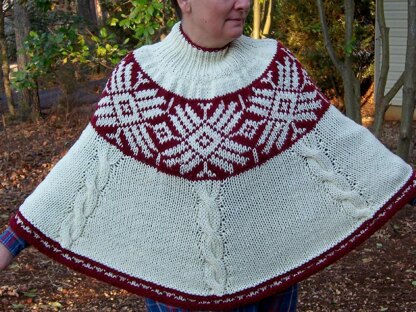 A cozy, winter-weight poncho that knits up quickly with chunky yarn. This poncho has a strong graphic look with its stylized snowflake and heavy contrast between the main and the contrast color used.