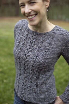 51.75I have been wanting to try a saddle shoulder design with a cable worked in the saddle that would continue down the sleeve. I snagged some Handmaiden Ottawa at TNNA and thought it would be the perfect choice for this design. I love the little specks of color that give it a tweedy look. This sweater starts in pieces and parts but once they are joined it is pretty straight forward. The cabled panel adds some natural shaping: therefore no body shaping after the armholes was necessary. The length of both sleeve and body are easily adjusted. I love this sweater, it is so easy to wear! It works works with jeans or dressed up with a pencil skirt. I wear mine all the time!