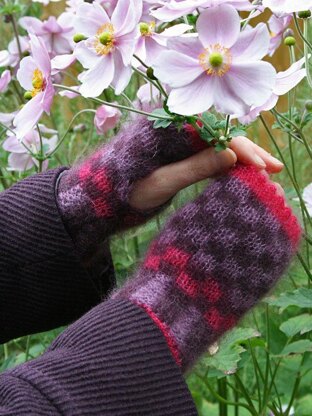 Anemone fingerless mittens are ideal as a first double-knit project. These gorgeous mittens are knit in rows using several interesting techniques. You start with a provisional cast-on, then knit a sweet picot hem which will sit around the fingers. Next you work the hand using double-knit stocking stitch in a simple grid pattern. Finally you work a double-knit rib, ending with a simple edging. Just one seam and you can wear your fingerless mittens.