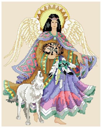 Designed by: Barbara Baatz Hillman\nCelebrate the history and tradition of the Southwest with this beautiful Native American Angel. This truly amazing design features a Native American angel with a wolf. The vibrant colors will bring serenity and peace into your home.