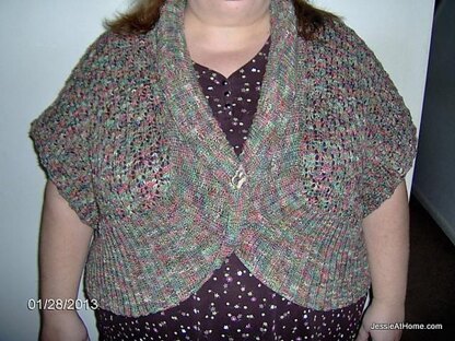 A while back I asked a group of ladies here what kind a pattern they would like to see. The first response was from [knilesknitter][1], and she said she would love a shrug that covered her breasts and stayed there. She loves the circle shrugs, but hates when they don’t actually close. This pattern is my answer to her problem. I have worked hard at being sure it will cover you up, whatever size you are!