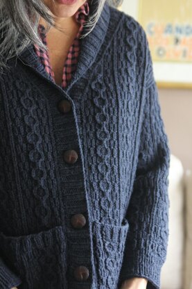 Delciate cables make for a gorgeous texture on this shawl collared, Grandpa-style cardi. Pockets and cozy buttons finish off the look. A worsted weight makes it super versatile! Body is knit flat from the bottom up, sleeves are worked in the round after body is seamed. Collar is shaped with short rows.