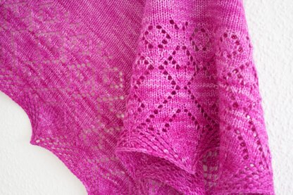 Le châle commence par une languette au point mousse et se développe depuis la bordure supérieure avec des rangs envers facilement mémorisés.