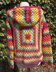 The squares are joined as you go, so there’s no seaming afterwards. The sleeves are worked in the round downwards from the shoulder to the cuff. The hood is worked upwards in one piece and there’s a short seam to close the top of the hood. This seam is worked in ss and can’t be seen, even when the hood is down. This pattern is great for using up yarn scraps.