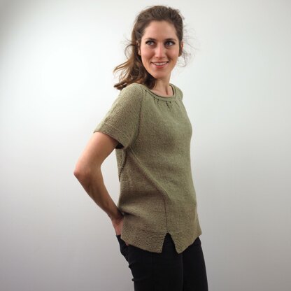 ANNCHEN is worked in stockinette stitch seamlessly from top down. The rounded yoke is shaped by yarn over increases (please see sketch). The body is shaped by side details.