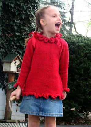 Oodles of ruffles at hem, cuffs, and neck add up to oodles of fun in this easy fitting, tunic length, girly-girl sweater.