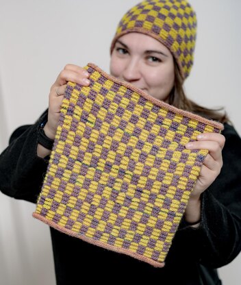 Inspired by the work of Anni Albers, Anni is a hat and cowl set knit in 3-colors of fingering weight yarn. The colorwork alternates between garter stitches and stockinette stitches to create a textured fabric and fascinating checkerboard motif!