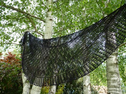 Taille : Approximativement 245 cm de large et 74 cm au centre Laine :6 pelotes noires de coton YOU 6 de chez Drops (100% coton, pelote de 120 m) Aiguilles utilisées : 4 mm Accessoires : Aiguilles droites ou aiguilles circulaires 80 cm, marqueurs Points utilisés : Jersey endroit et envers, jeté, surjet simple, 2 mailles ensembles, maille torse
