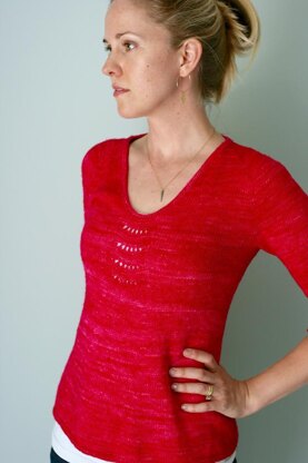 During an annular eclipse a few summers ago, my son happened to stand in front of the window in such a way that the pattern of little eclipses created by the window blinds fell right on the middle of his shirt. I thought this sort of pattern would make a lovely embellishment for a knitted top, and, after playing around with some yarn, was able to achieve the effect using a very simple lace pattern based on Feather and Fan. The rest of the top is quite flattering, with a soft v-neck, empire waist, and subtle pleat. The use of fingering weight yarn makes for a light and airy piece. Originally published as the Eclipse Top in Knitscene, Annulaire now includes a wider range of sizes as well as streamlined pattern instructions.