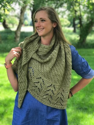 This asymmetrical ‘Anthem Shawl’ uses a fun combination of right and left leaning stitches to create diagonal ribbing for a majority of the shawl. The end is then completed with a geometrical lace design. This shawl is designed to wear draped over your shoulders or wrapped around like a cozy, oversized scarf.