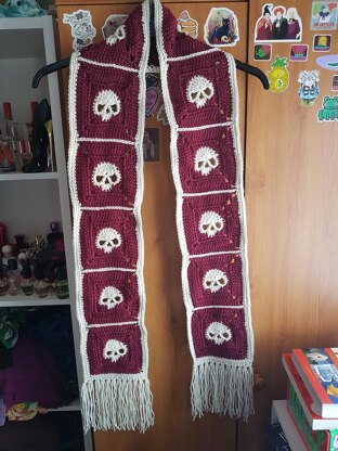 A granny square scarf with a skull motif and fringe. Information included to adjust the size. Granny square is 14cm by 14cm. Two colours are needed of aran weight yarn, white or cream is best for the skull part.