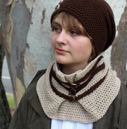 A classy, stylish steampunk inspired cowl using any type of hardware you can imagine to create the look you want. Created as a companion piece to Antique Brass Hat and the second pattern from the ‘Antique Brass Collection’.