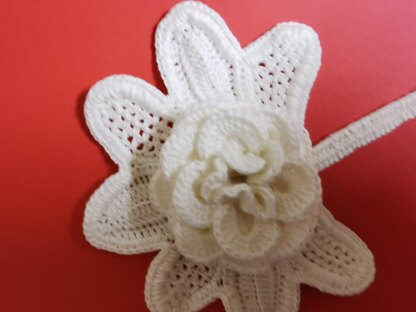 Pattern for antique raised rose on the leaf. The motif made over the cord, what make it harder on edges. Rose is made over the cord also and petals are overlapping on each other.