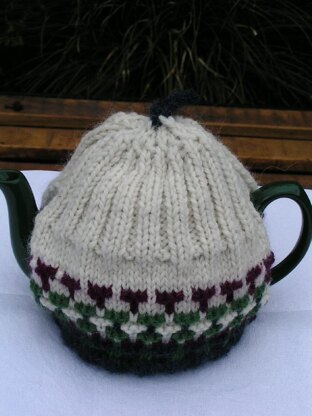 This cosy has a cream base and two choices of colourways. The cosy will fit a standard sized teapot. The cosy has a vintage feel, hence the title. The cosy can be knitted in double knitting or aran wool and I stock the wools on my website as well as kits for making it. The pattern is suitable for intermediate knitters.