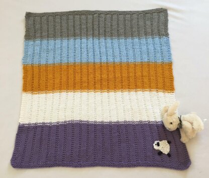 A fun way to use up various colors of your yarns! Anything goes here, any colors you wish to put together. Try different shades of blues, or shades of pinks, or mix and match colors for a unique, cute blanket! This blanket has a frolicking sheep added to the corner of the blanket, just for fun!