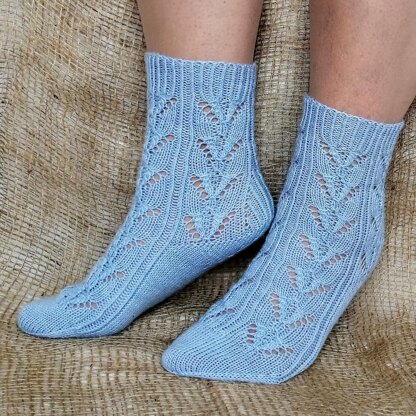 The Apennines sock pattern features a Japanese lace pattern all over the sock, an historical Estonian wedge heel construction with gusset, and the Barn Toe. The socks are worked cuff down. A light fingering weight yarn was used for the sample socks. Socks can be worked on double pointed needles, two circular needles or on other types of needles convenient for the knitter for knitting small circumference in the round. The pattern uses metric and imperial systems. The lace pattern is charted and written.