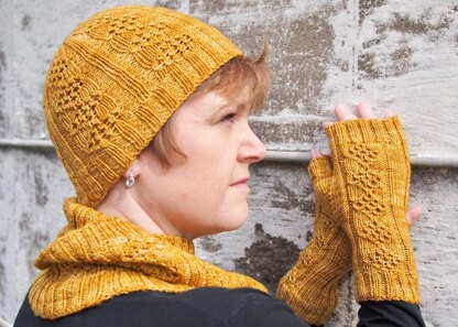 Apiary fingerless mitts feature a pattern reminiscent of a beeswax comb. The name comes from a beekeeping friend. There are also a matching hat and cowl available.