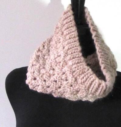 This richly textured cowl with eyelets is seamless since it is worked in the round on circular knitting needles.