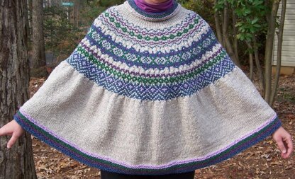 The full poncho is 24-inches form neck to hem with a 100-inch circumference at the hem. If you’d like to make a shorter version, I include directions for making a 14-inch (neck to hem) with an 80” circumference (basically finishes after the final colorwork panel and then adds the garter hem).