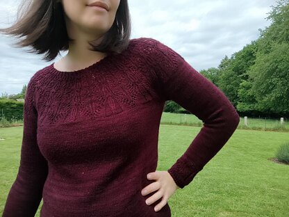 Aptenia is a yoke sweater knitted in the round, top down. It has a superb lace on the upper body and a reminder at the bottom of the sleeves.