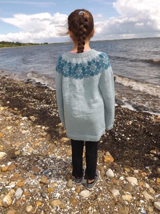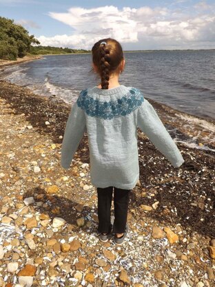 The pictures shows a 12 years (modelled by a 9 year old) knitted in Drops Merino Extra Fine.