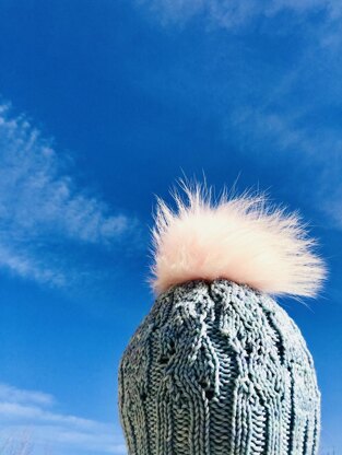 Here’s to the beautiful aquamarine blue skies of a crisp fall day! I designed this hat bottom up. It has an easy mock cable lace pattern that runs up to the top. One size fits all: 17” x 8.5”. Faux Fur Pom Pom optional.