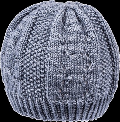 The aquilegia hat features simples eyelets pannels and seed stitch, which are folded in pleats so the crown ends up with seed stitch only.