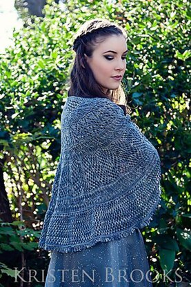 This semi-circular shawl features geometric lace sections and twisted-stitch spider sections, mimicking Arachne’s web. The increases are worked between pattern bands using yarn-overs. The shawl is worked beginning at the neck down to the hem, with a garter-stitch tab.