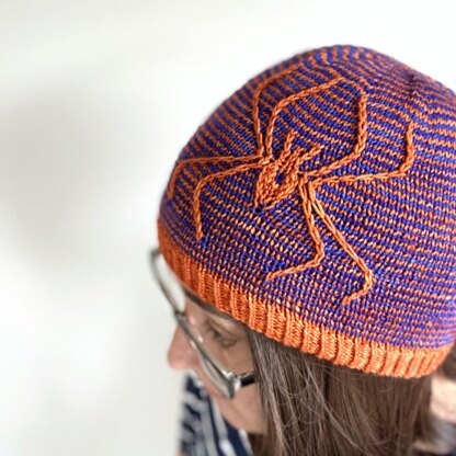 Arachnid is a beanie style hat with a large spider motif, the spider is created with small cables and slipped twisted stitches, only one colour of yarn is used on every round.